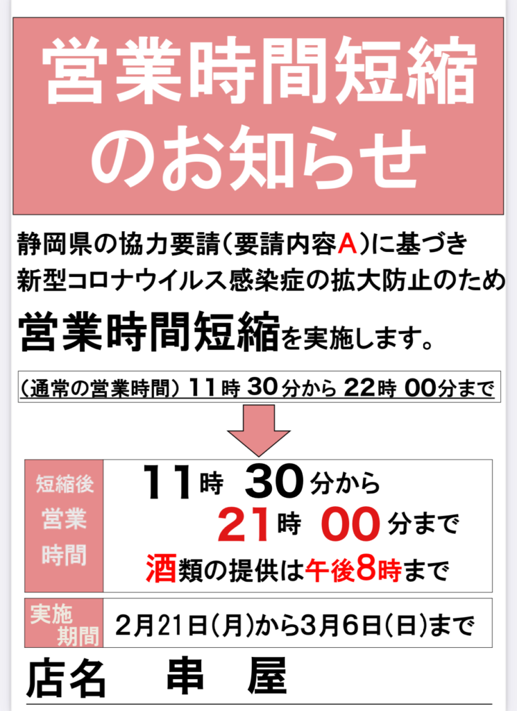 2月21日(月)〜3月6日(日)までの期間【まん延防止等重点措置】適用に伴い営業時間を11:30〜21:00までとさせて頂きます。《酒類の提供は20:00まで》です。